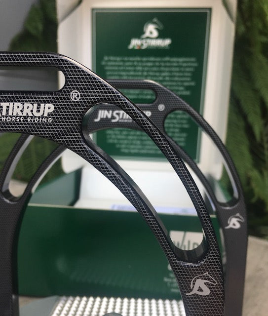 Jin Stirrup model ‘Carbon Look’ Stirrup, realised from all Aluminium are a beautifully engineered and Italian made stirrup. The Peculiarity of the new stirrup is that it is all angled, also the bench (where you rest your toe/foot) has been more inclined to allow better lower leg position and grip !