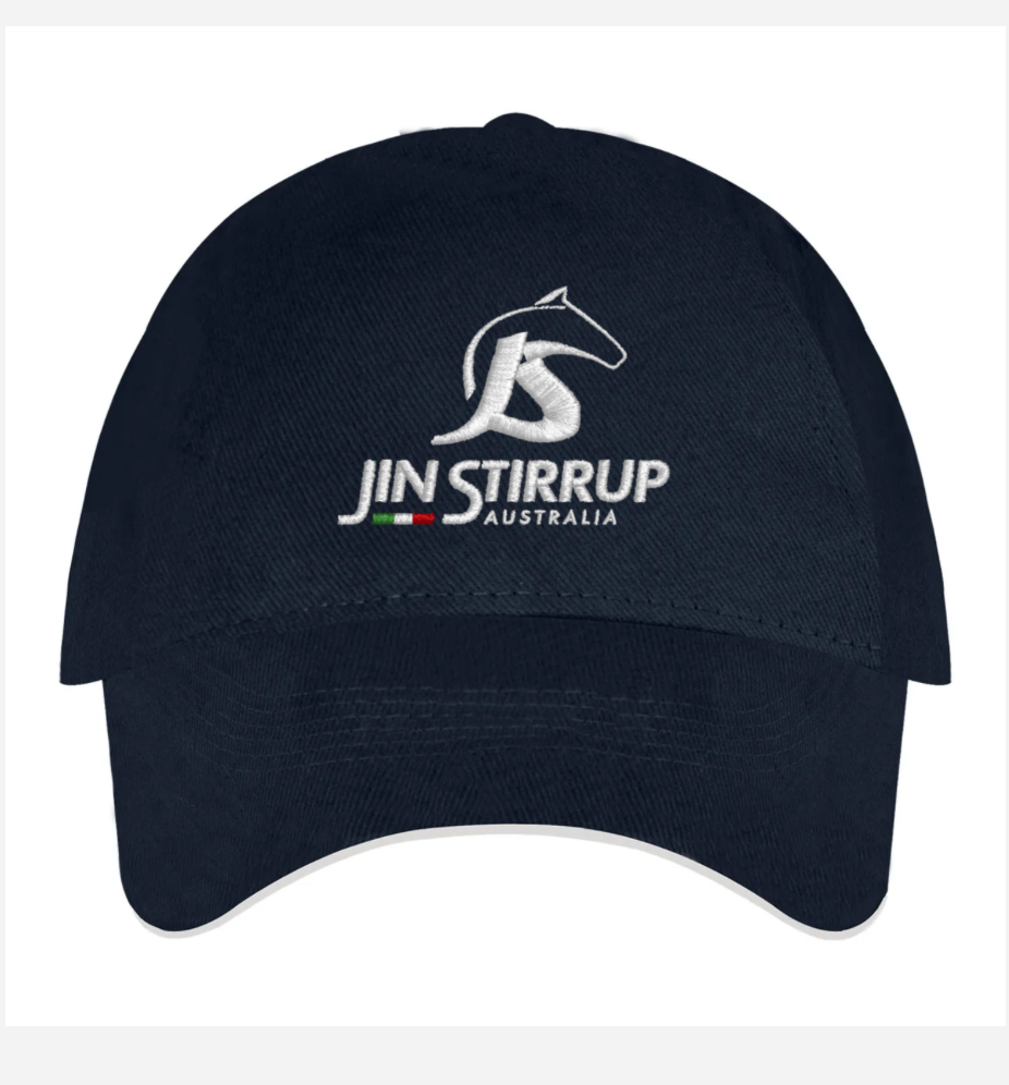 Navy cap with Jin Stirrup Australia logo embroidered. White underside of peak. One size fits all.