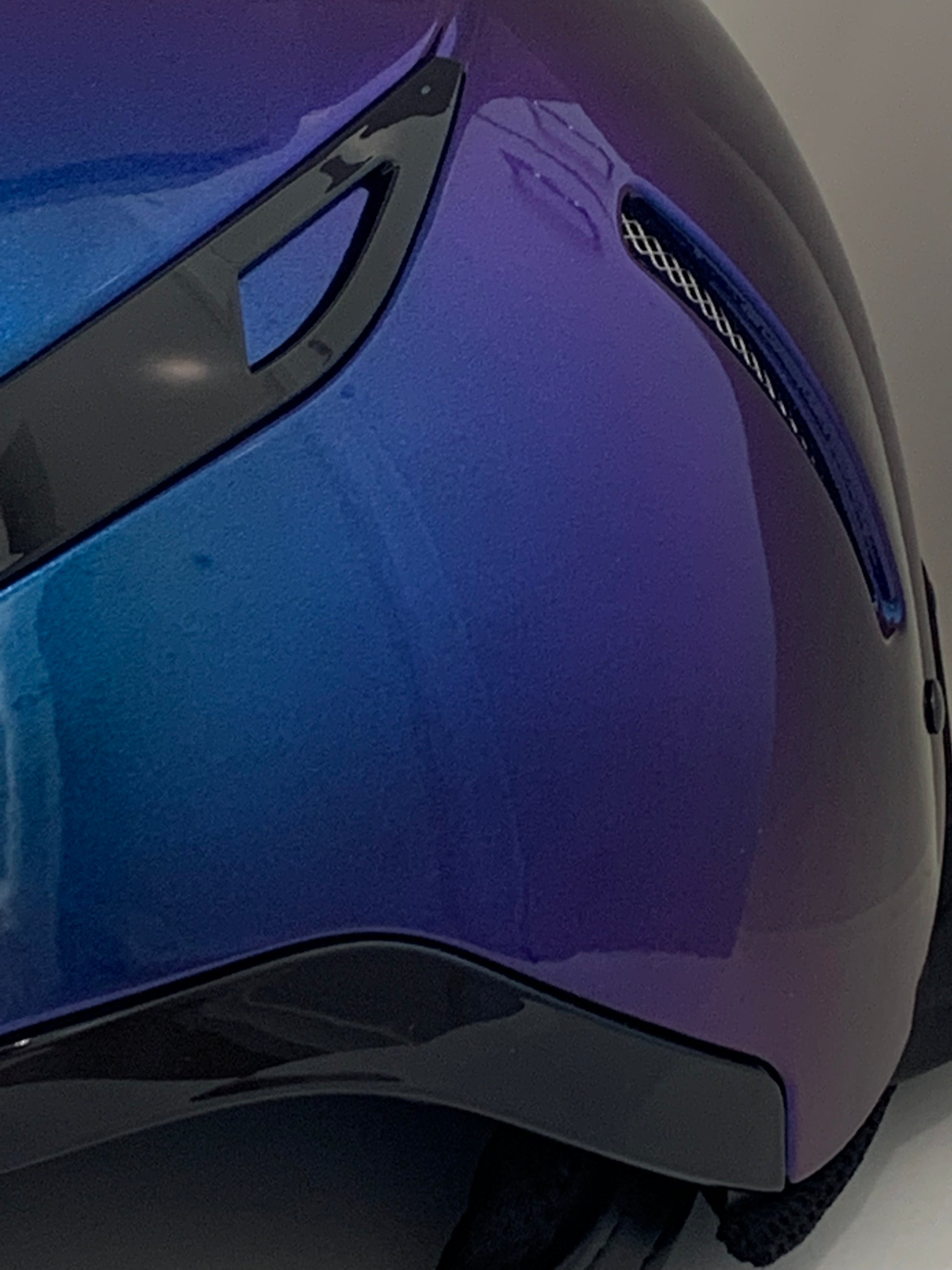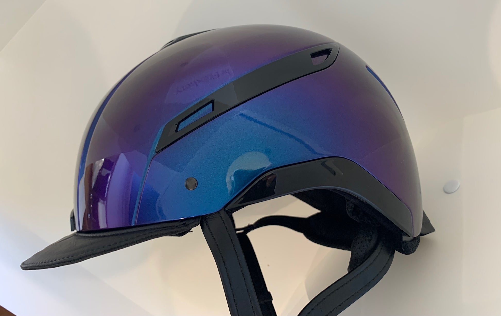 Jin Stirrup Helmets are produced with composite fibres including glass and kevlar which make our riding hats one of the safest helmets with the added bonus of being lightweight and comfortable to wear. Finished in a high gloss Camaleonte paint (changes colours like a Chameleon). The latest in design this JS Cap appears as a brilliant blue gloss that changes to a shimmering purple in the right light. A divine colour with a little edge. Finished with Black Leather Peak and Black straps this is the latest in design and engineering. One of the most highly homologated helmets on the market today! JS Caps are known for their safety in engineering and testing, light weight feel and ventilation system. Our helmets are rotationally tested and designed to glide on impact.