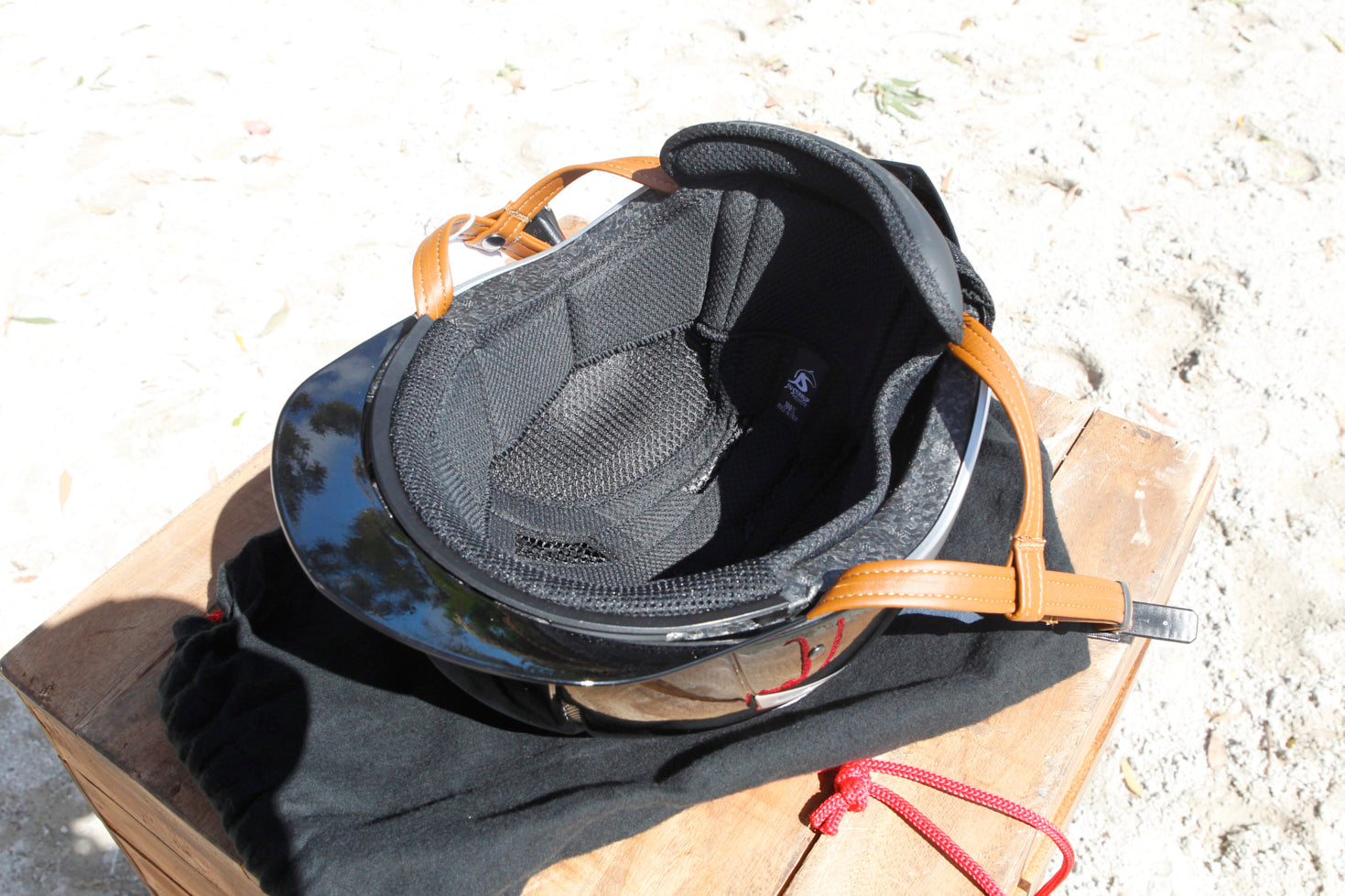 JS Icona Helmets have a removable inner pad that is fitted easily to helmet to allow for washing. The straps are a weather protected patent leather strap with quick release clasp.